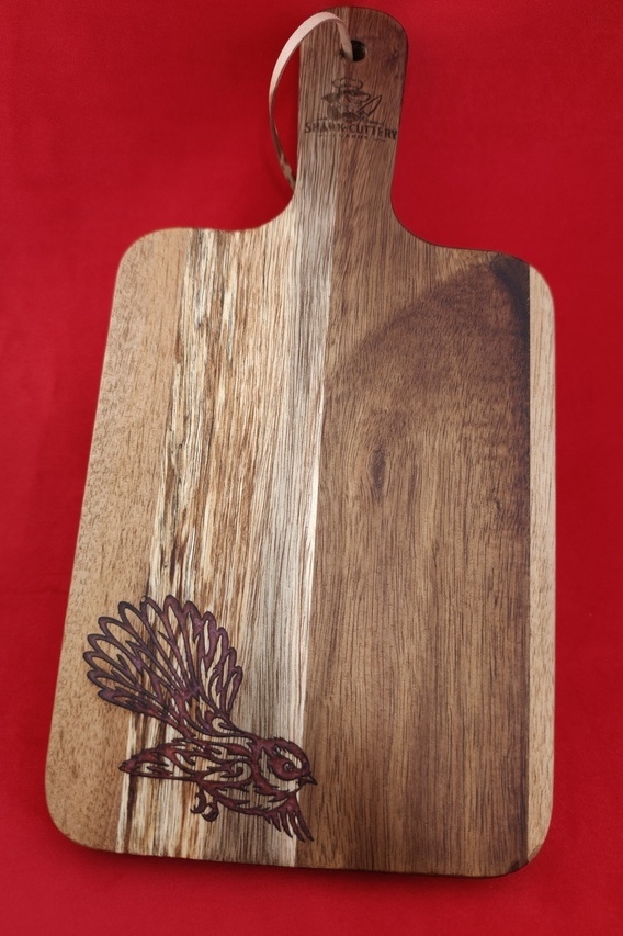 Serving board with fantail engraved and filled with harlequin resin